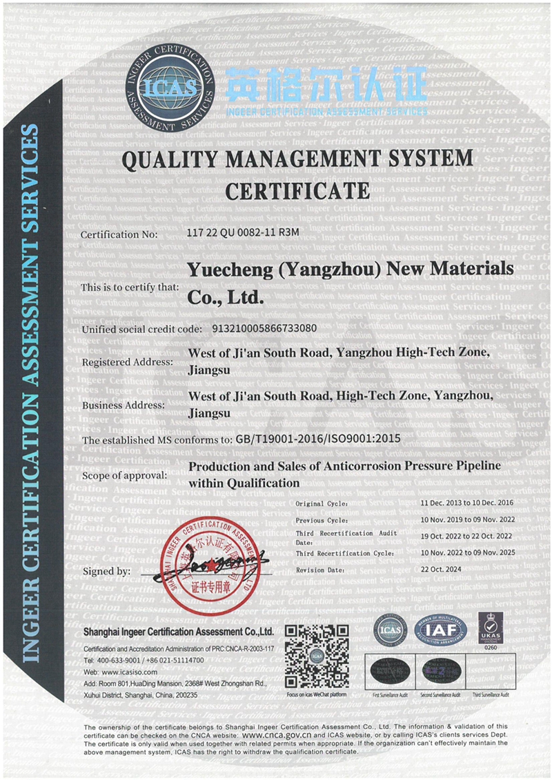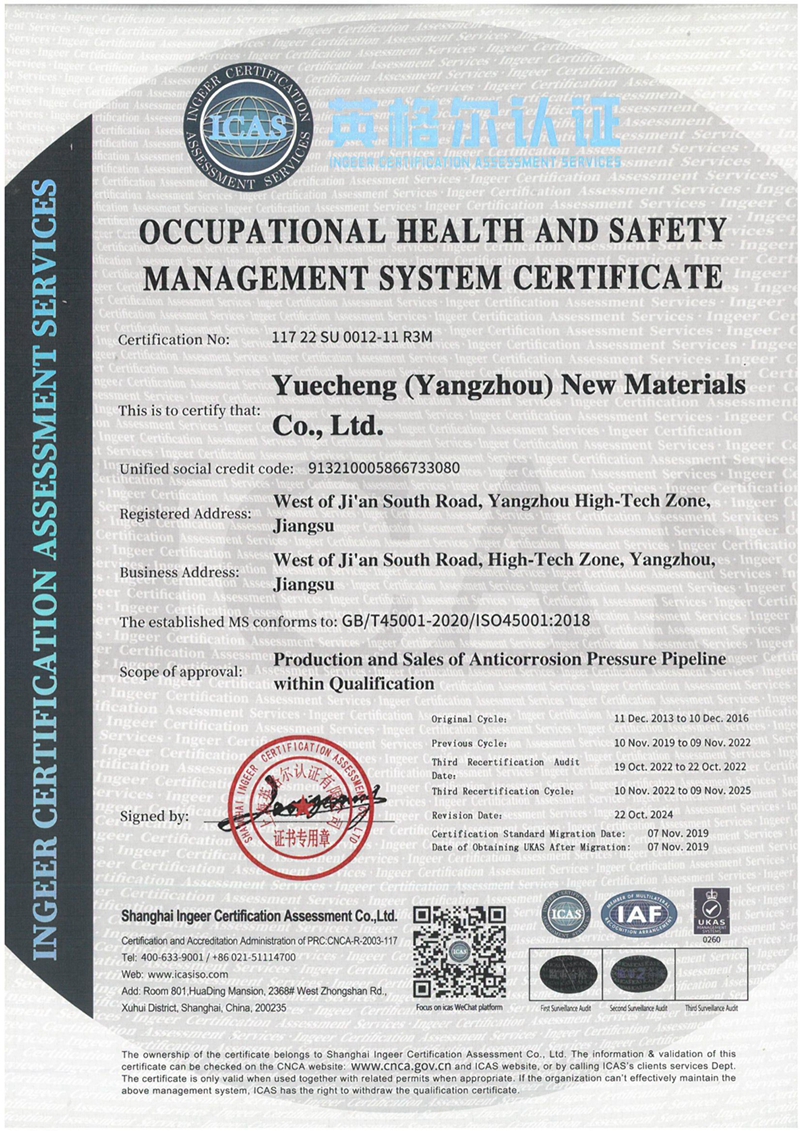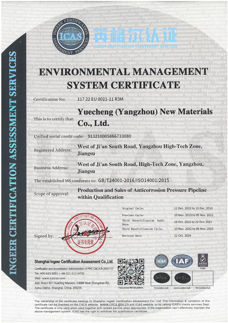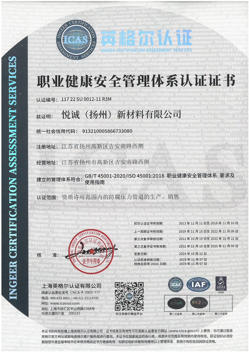 悦诚(扬州)新材料有限公司专门是从事石油天然气管道防腐加工及销售的实体,公司始建于2011年,坐落于江苏省扬州高新技术开发区,公司占地69403㎡,现有员工90人,其中中等专业技术职称以上的有12人,人员结构的高起点保证了企业发展的高效与有序。