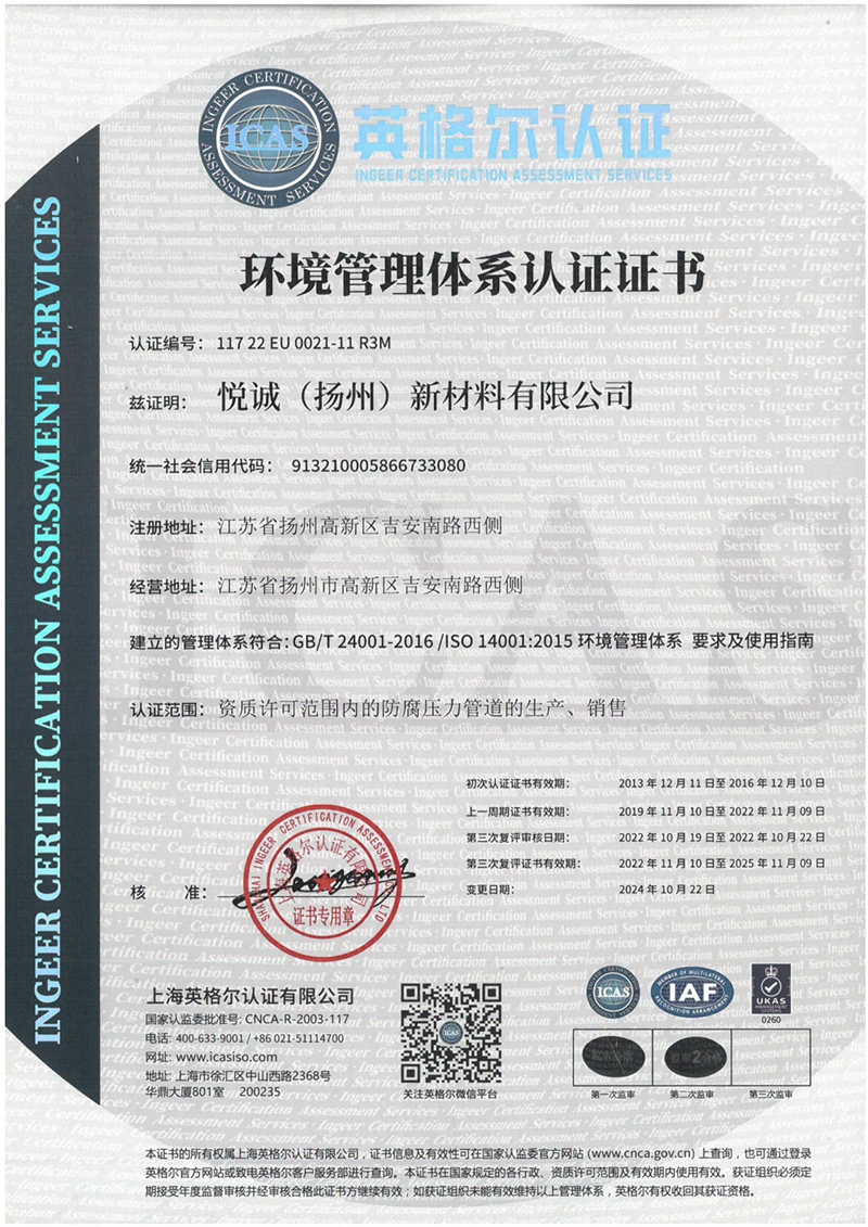 悦诚(扬州)新材料有限公司,注册资金6953万元,主要业务范围包括管道(弯管、管件、金属结构)内外防腐、储罐防腐、防腐保温、防腐材料研发及生产销售等各个领域,可承担Φ60mm—Φ3050mm各种型号的钢管防腐和其他金属结构的防腐保温工程。主要防腐产品有3PE(三层聚乙烯)外防腐、3PP外防腐、2PE外防腐、单环氧、双环氧、内减阻涂层、内涂环氧粉末等。